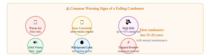 ก failing or dirty condenser directly degrades your air conditioning system's performance and efficiency. Watch for these warning signs: